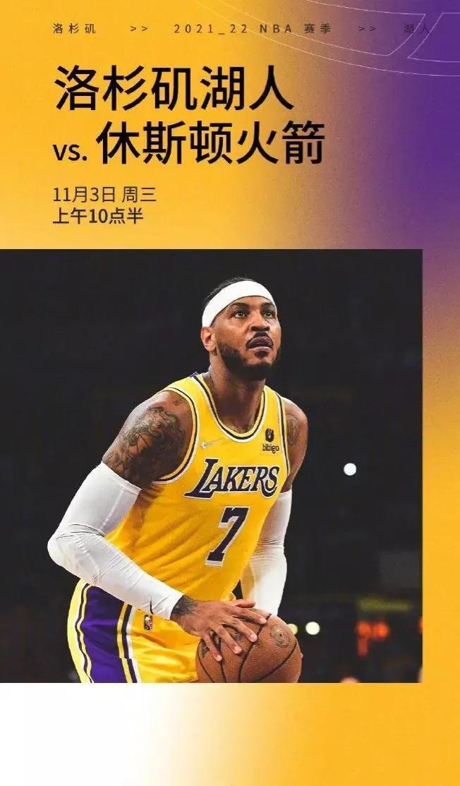 赛事类型: NBA常规赛 比赛时间: 2021-11-3 星期三 10点30 对阵双方火箭队VS湖人