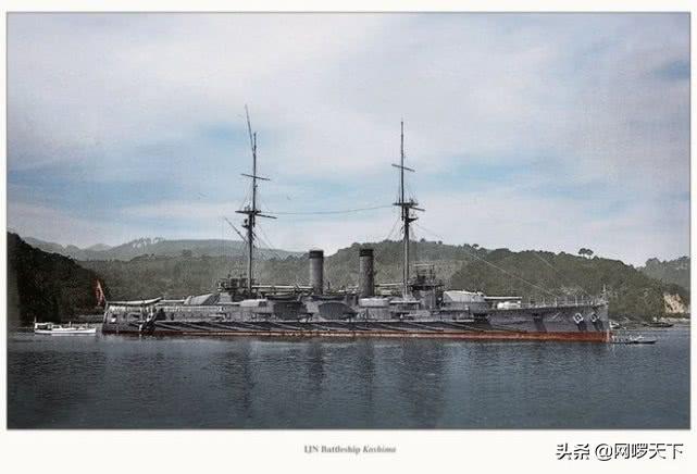 鹿岛号战列舰(前弩型香取级战列舰,很怪的名字),舰长143.3米、舰宽23.8米、标准排水量16400吨。老式战舰火力也很密集,装备305毫米45口径连装炮2门、254毫米45口径单装炮4门、152毫米45口径单装炮12门、76毫米40口径单装炮16门。