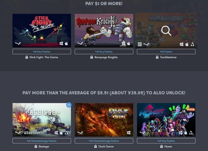 支付底价(1美元)可获得《火柴人战斗》(Stick Fight: The Game)、《暴虐骑士》(Rampage Knights)和《翻滚的石头》(Tumblestone)。 支付均价(目前5.51美元)可获得《围攻》Besiege、《鸭王争霸赛》(Duck Game)和《悬浮》(Hover)。