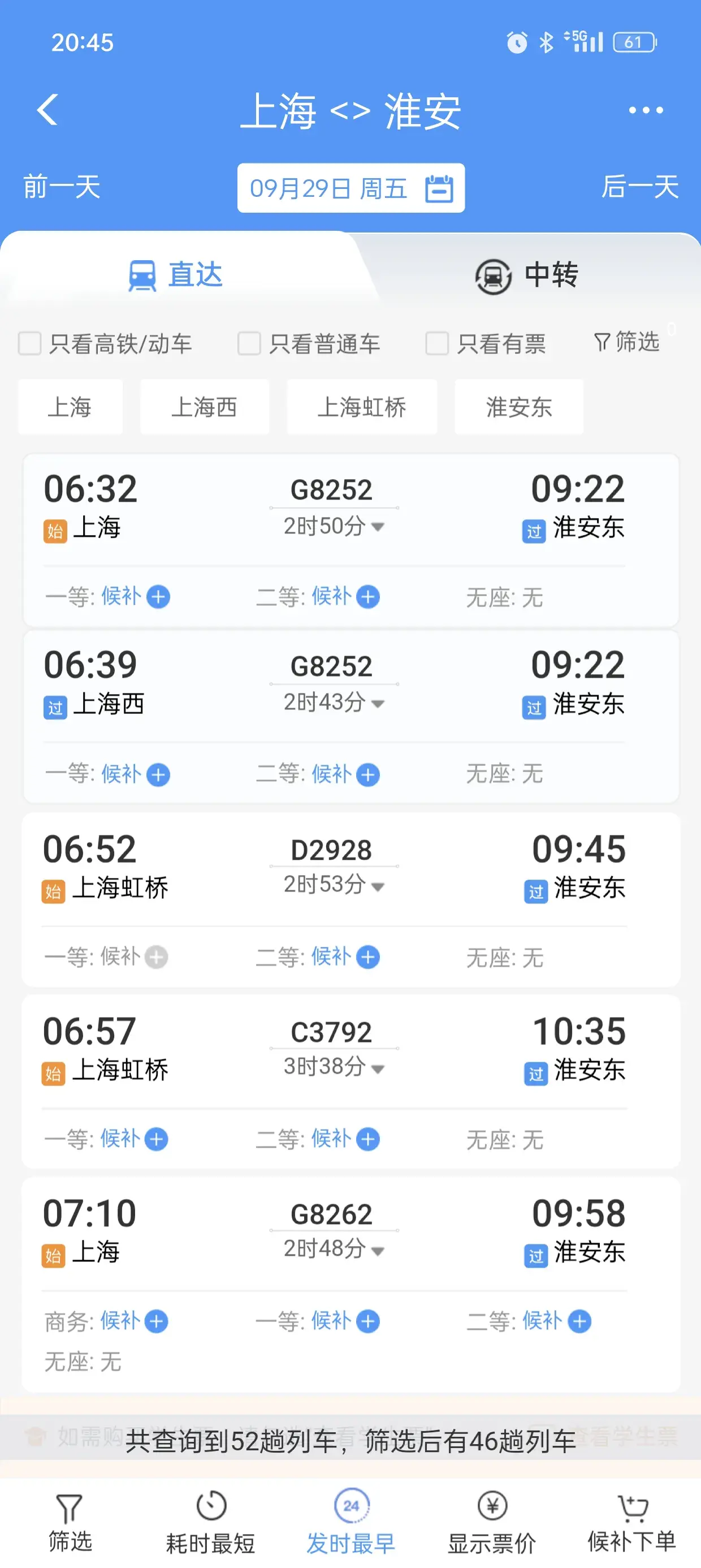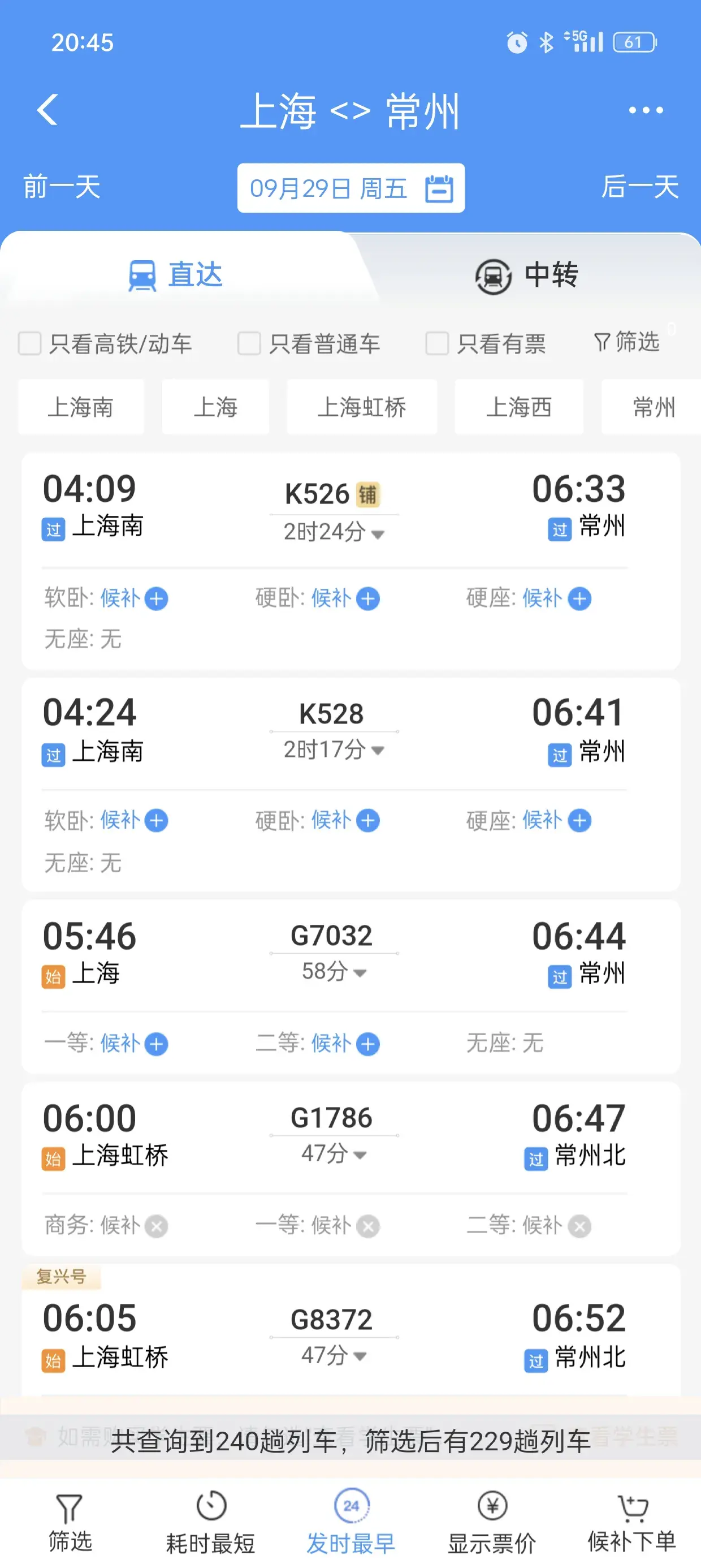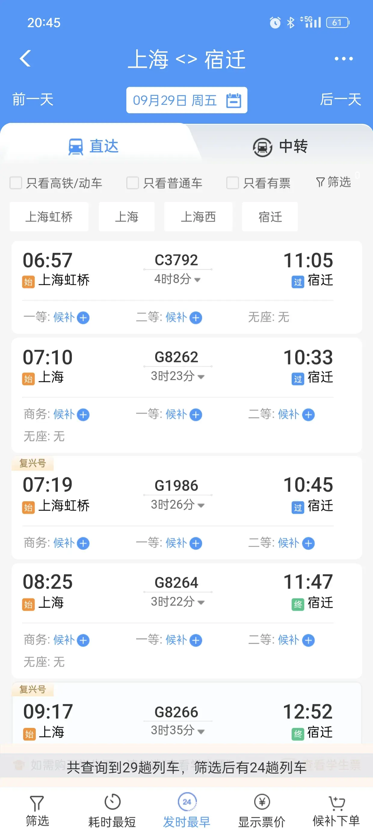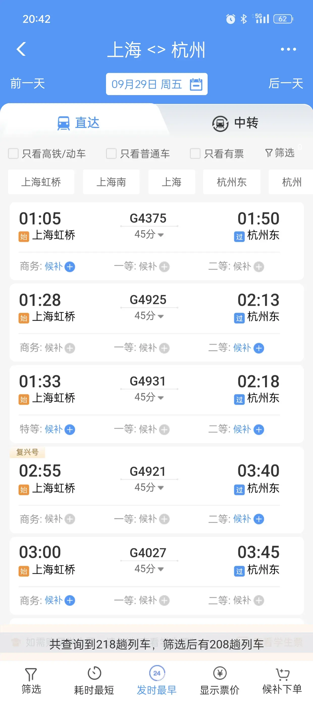 首先看一下上海到杭州的,作为一个参照,29号当天共有208趟火车高铁。