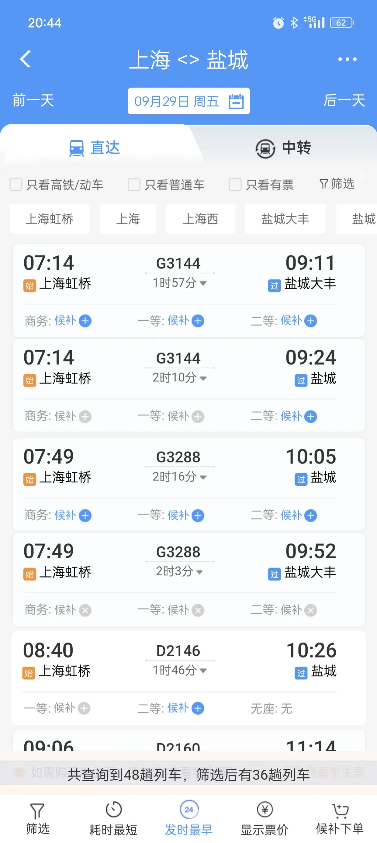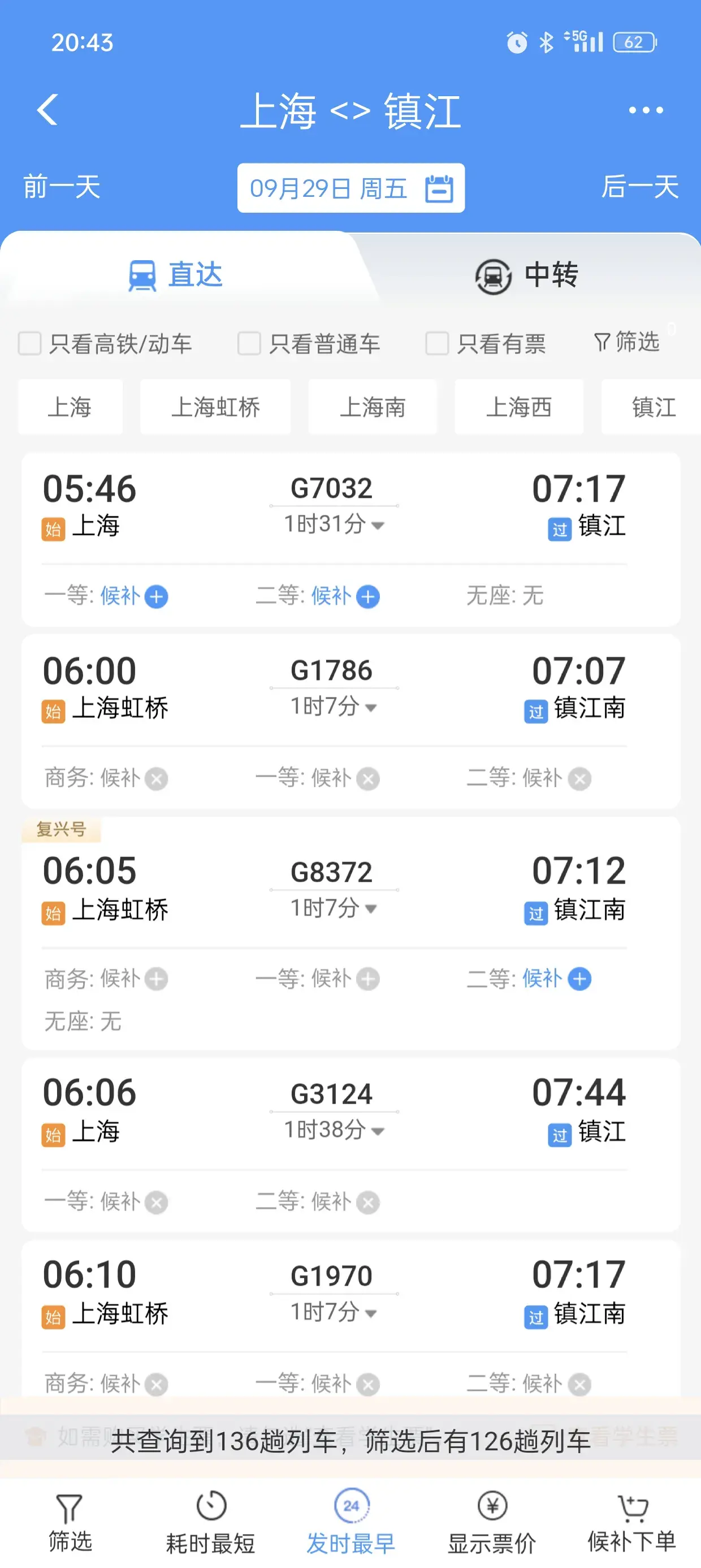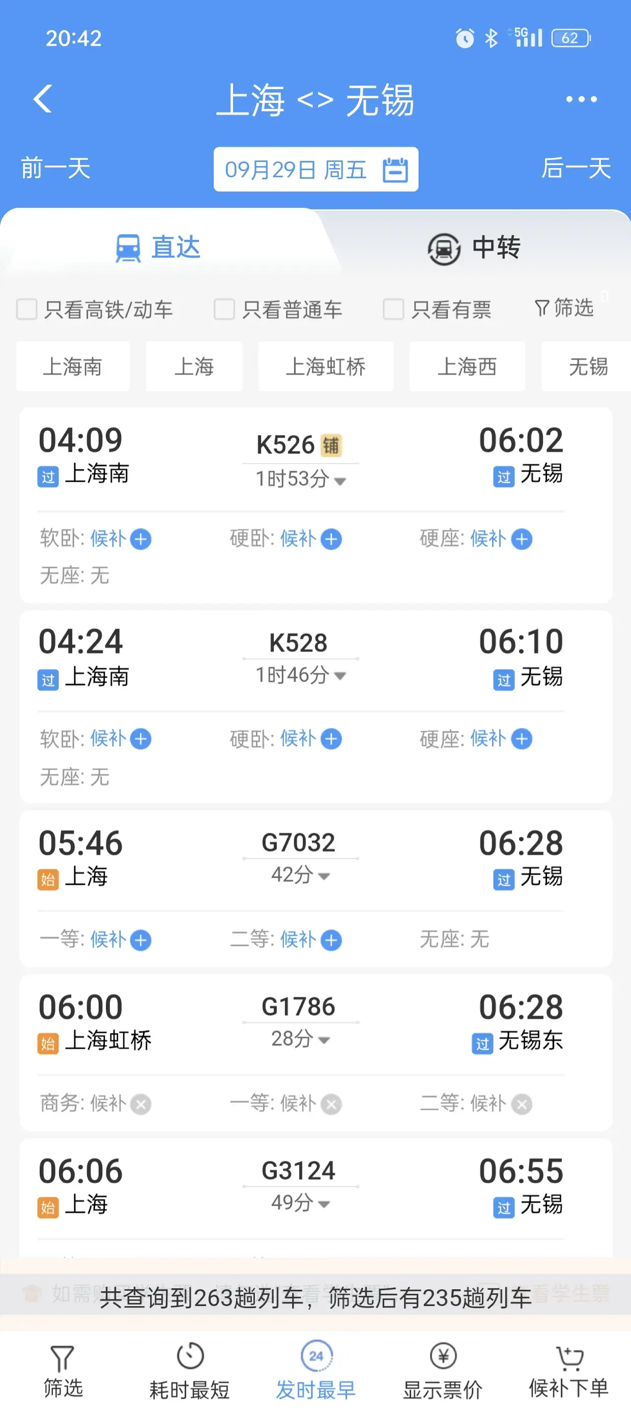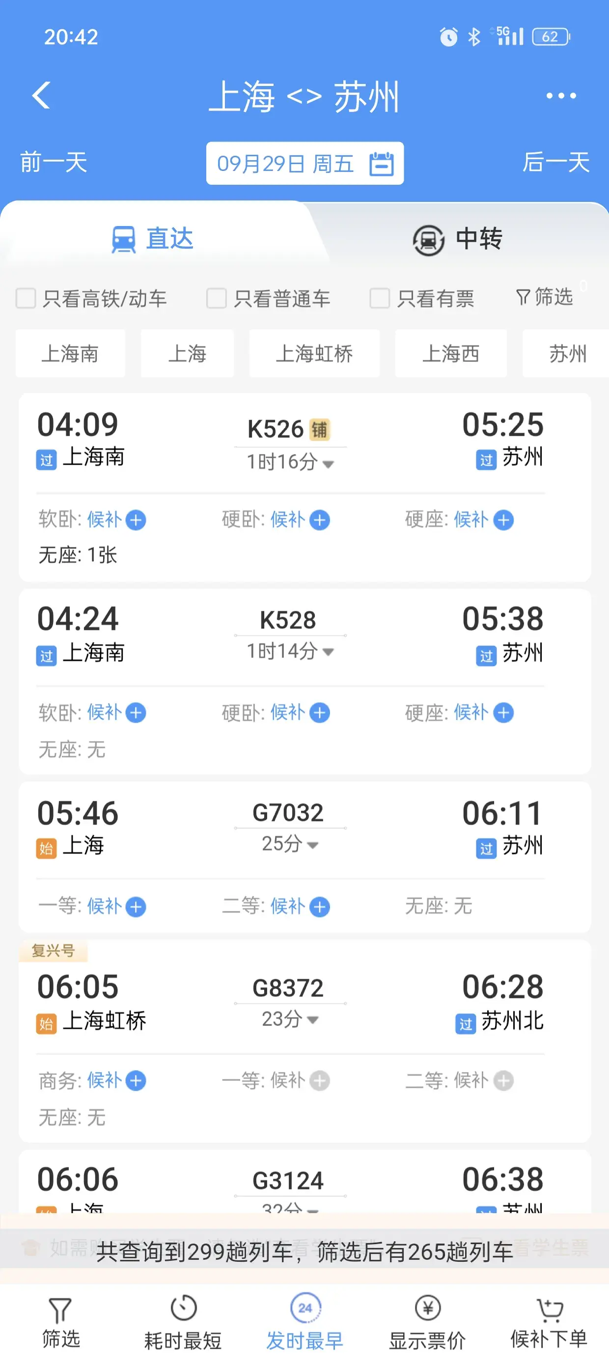 首先看一下上海到杭州的,作为一个参照,29号当天共有208趟火车高铁。