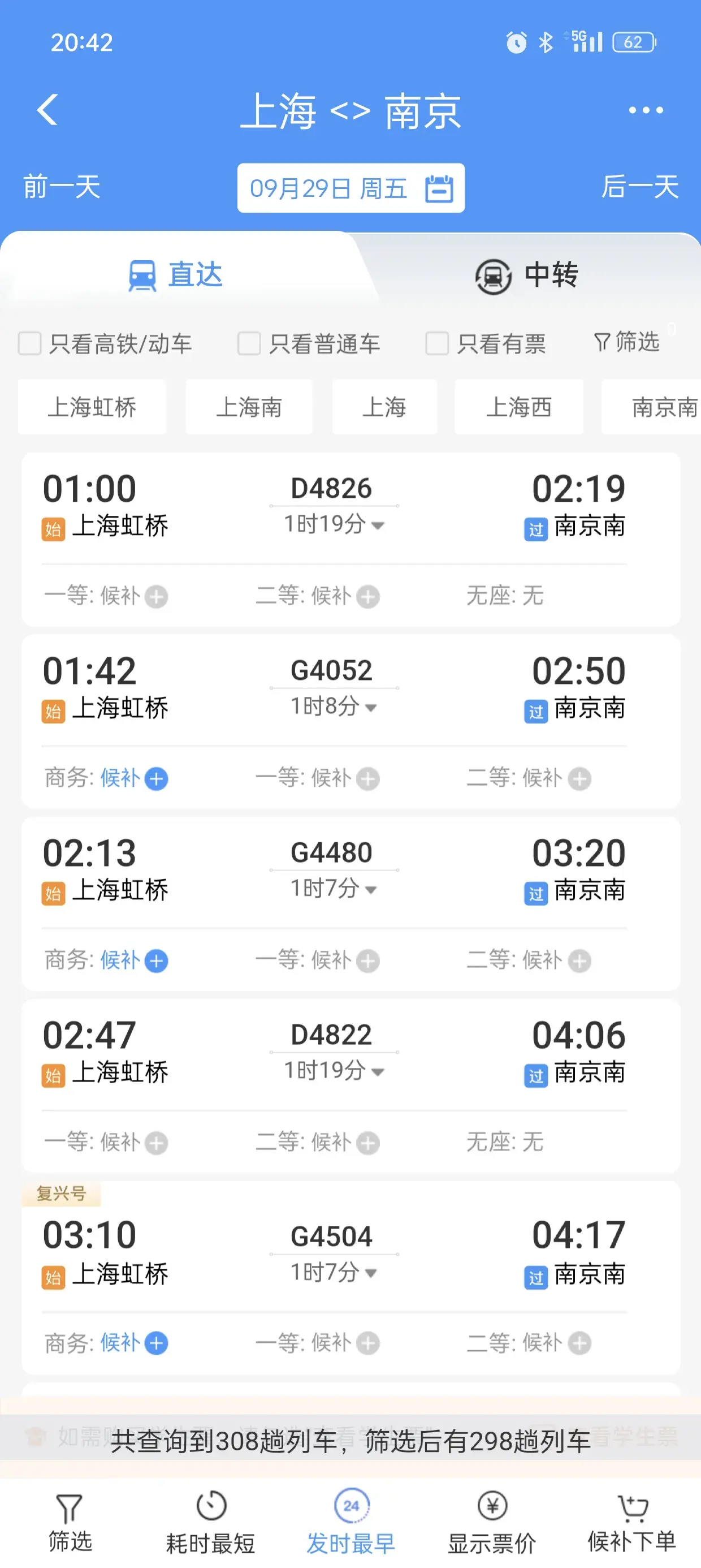先看一下上海到北京必停的南京,车次达到了惊人的298趟,但感觉好像没有以前多,以前好像都是300多趟?
