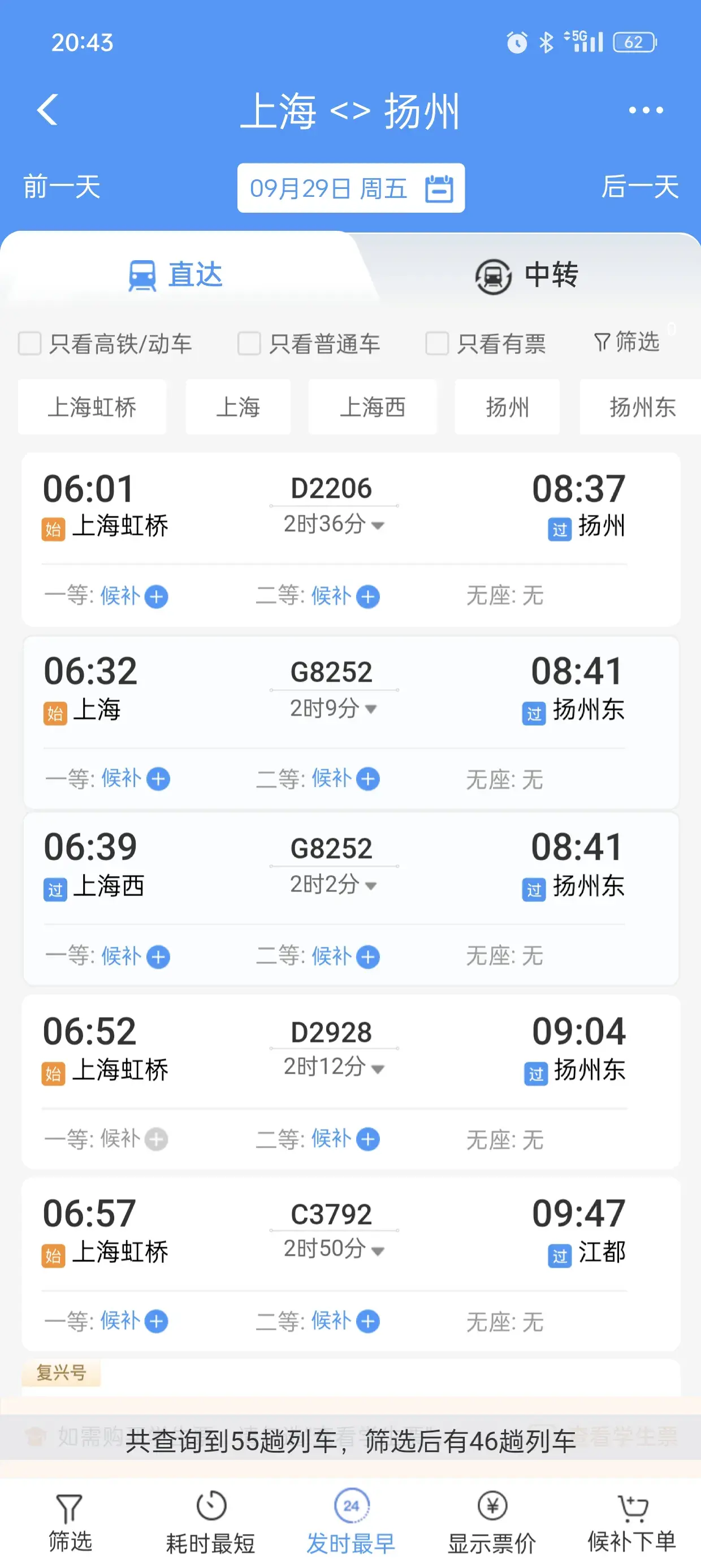 上海到扬州有46趟,全都是高铁,没有普通的火车。