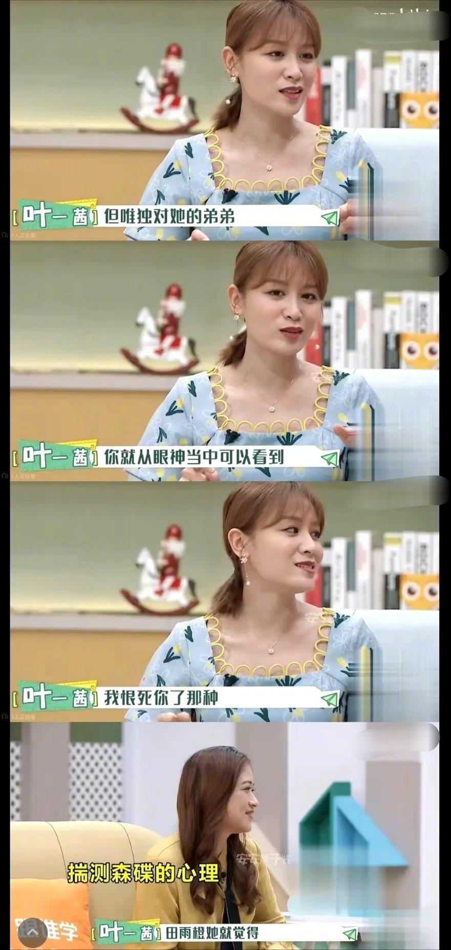 在节目上说在节目中,“叶一茜表示森碟对全世界的人都非常友好善良,但唯独对她的弟弟田雨橙,从眼神当中可以看到她恨死弟弟的样子。”她还表示“森碟觉得弟弟是这个世界上最有心机的人。”