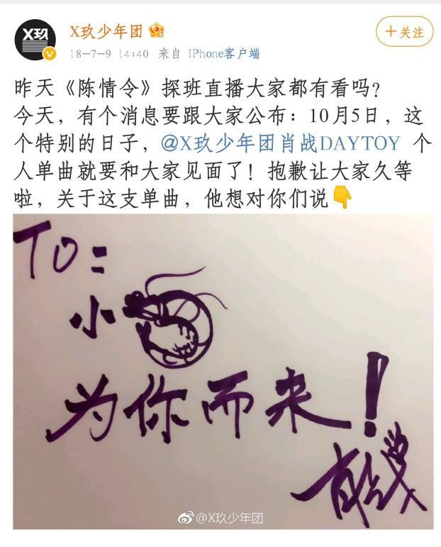 在一八年七月九日,肖战发了一条微博,《陈情令》探班直播也公布了好消息,十月五日首支单曲要和大家见面,他对小飞侠说的就是一幅手绘图,上面画着“小为你而来”,因为这幅图天上飞的就变成了水里游的了,小肥虾也从此诞生了。