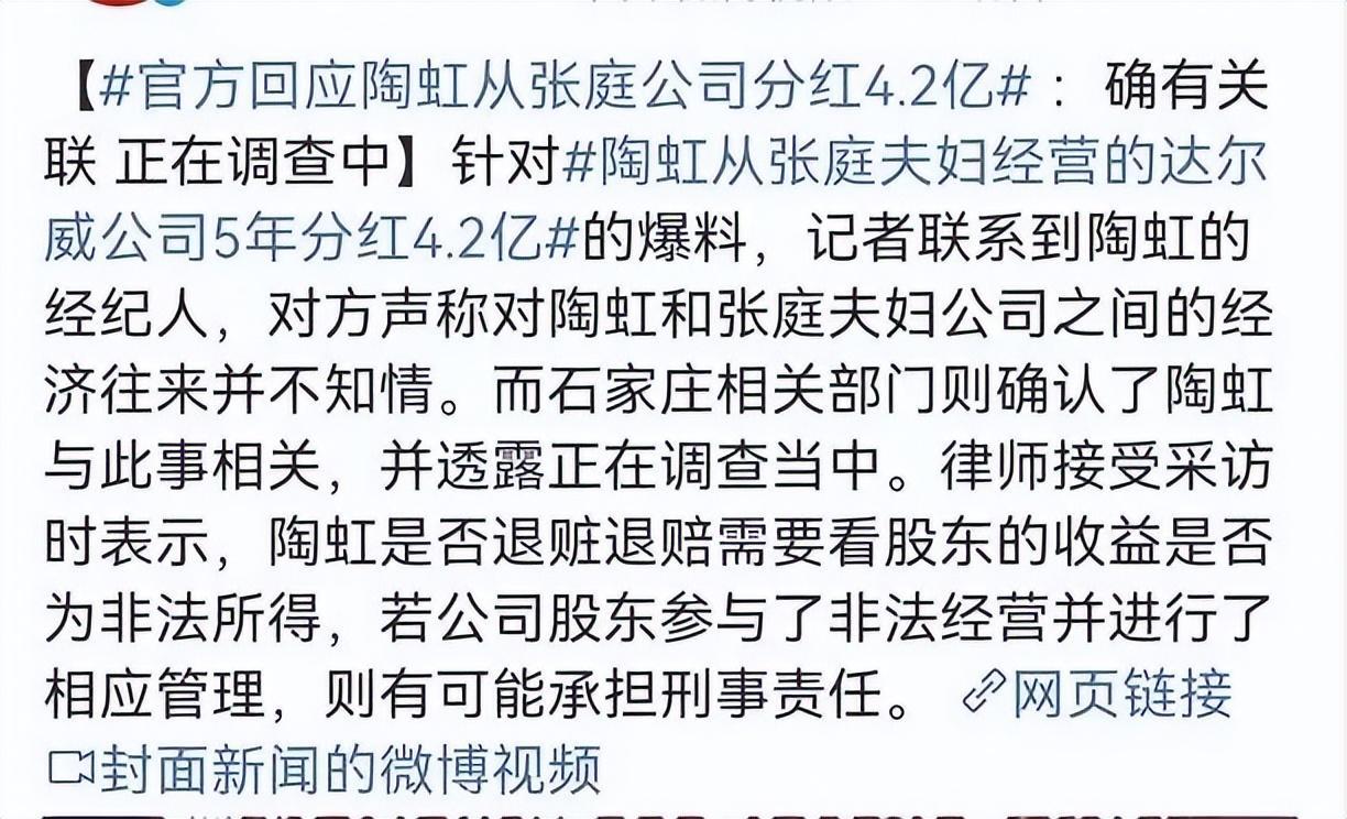 本来以为张庭林瑞阳出事之前,陶虹即使退股能够撇清关系,现在想来看,应该是理想状态了,现实可没有那么完美!毕竟,陶虹在张庭企业还有年分红啊,这意味着什么不用多说了!