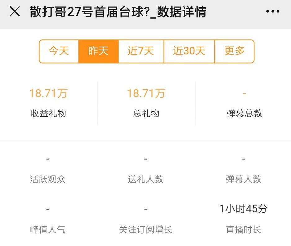快手网红散打哥昨晚在直播间举办了台球赛,人气一开始有点低迷,毕竟在同一时段,主播二驴邀请了王力宏、孟美岐、汪峰、中国好声音吉克隽逸等等明星网红在表演节目,随后他突发奇想,来了一个剧本上演,人气随后高涨,甚至有一时段超过了二驴那边。