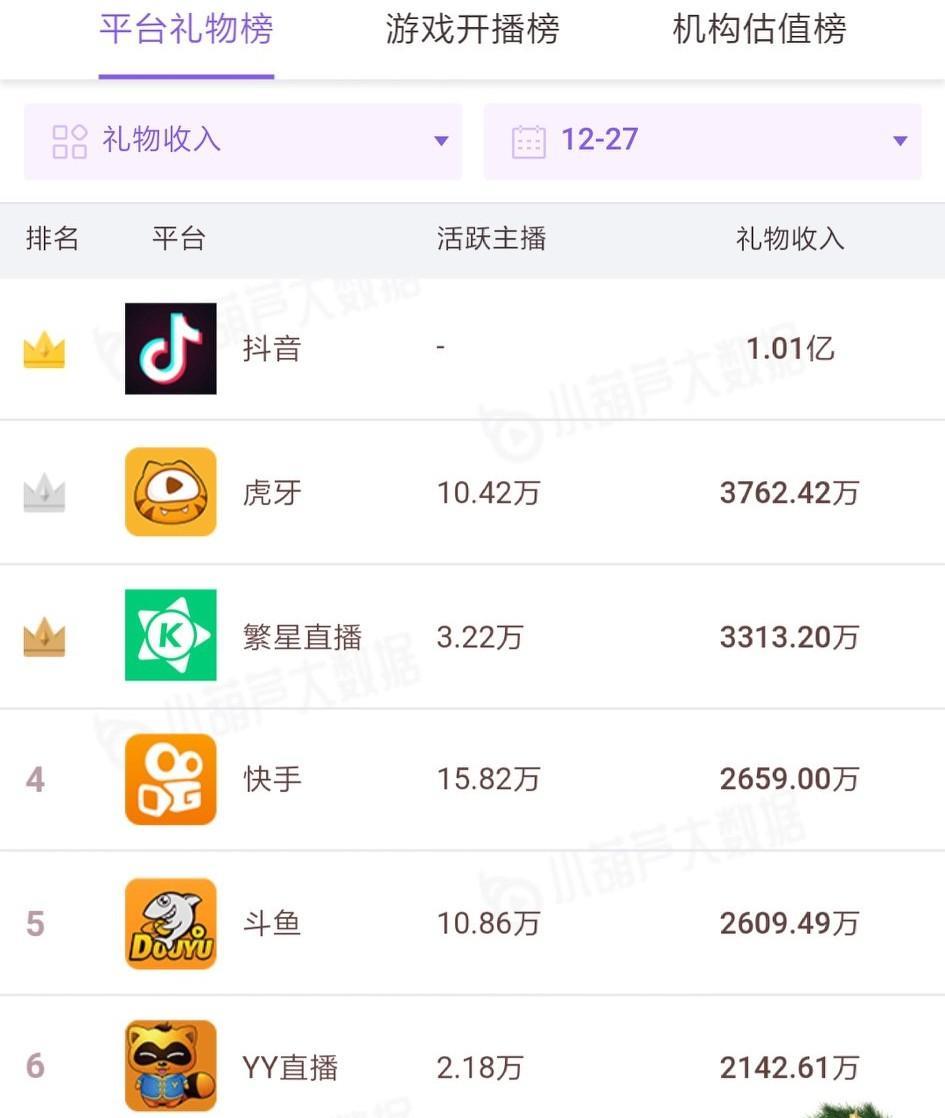 小编不得不说,最近快手官方明显给力了很多,但是这个代价确实蛮大,你看昨天全平台礼物收入榜,快手已经落后于抖音、虎牙和繁星直播,只有差不多抖音收入的四分之一,全天才2659万元礼物,而且最近没几个大主播在开直播,不是被封,就是在躲风头不敢开播。