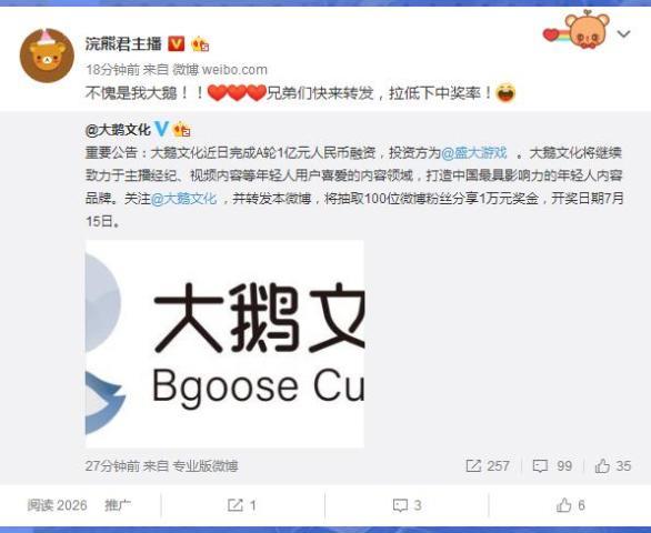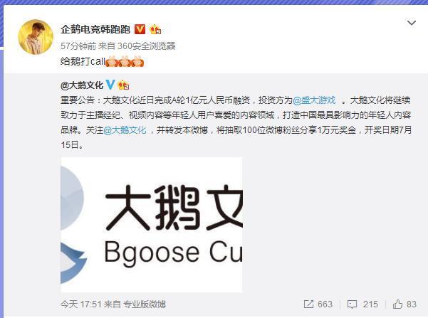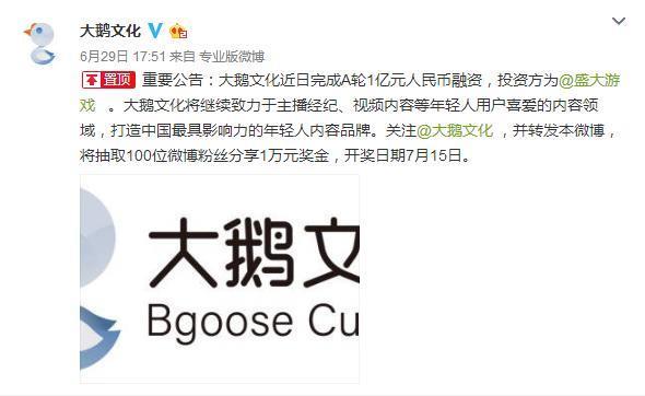 在6月29号,大鹅文化发布重要公告:近日完成A轮1亿元人民币融资,投资方为盛大游戏 。大鹅文化将继续致力于主播经纪、视频内容等年轻人用户喜爱的内容领域,打造中国最具影响力的年轻人内容品牌。