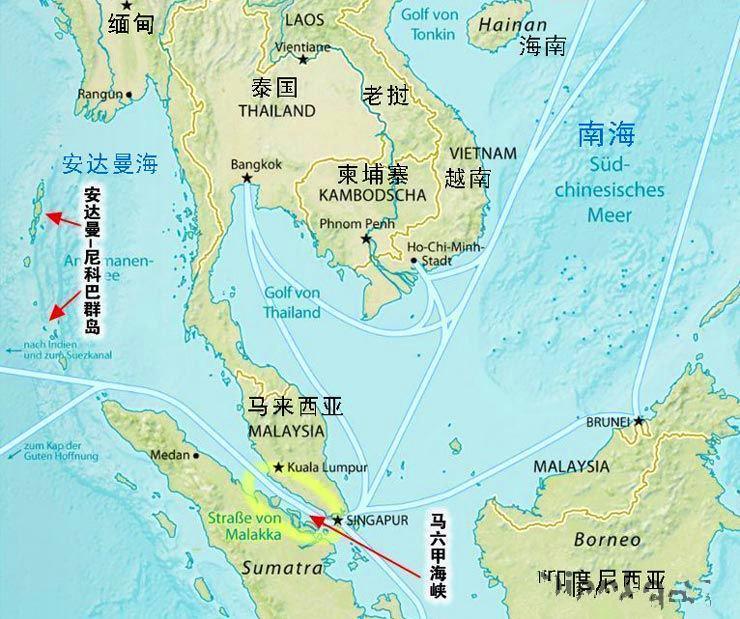 四,印度在安达曼-尼科巴群岛设有军事基地,美国在新加坡设有樟宜军事基地;两国在战时都可封锁马六甲海峡。