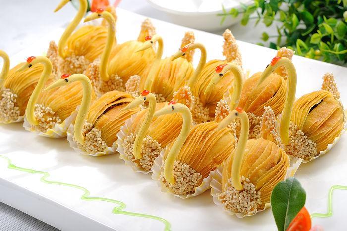 冰花锅贴,蟹黄烧麦,天鹅酥,象形枇杷后面这四道菜,严格意义上讲应该不算菜,算是点心吧,可以看出它们都是以面食制作而成,而且汇聚了南北方的地域特产,比如锅贴是北方人喜欢的美味,而蟹黄烧麦则是港台地区的美食之一。
