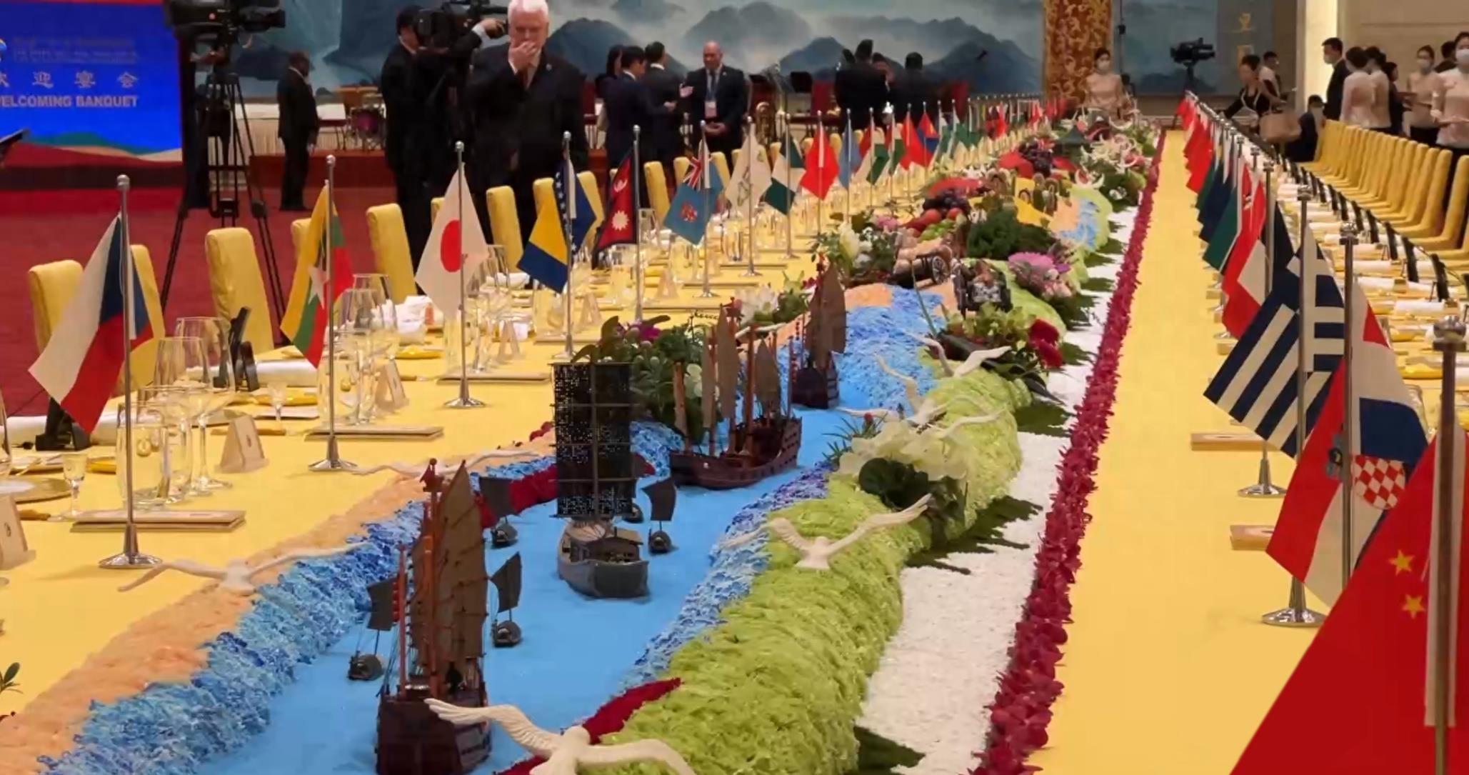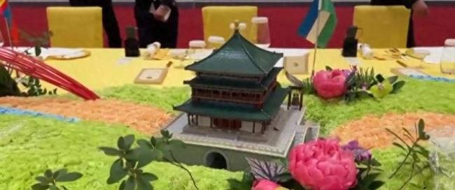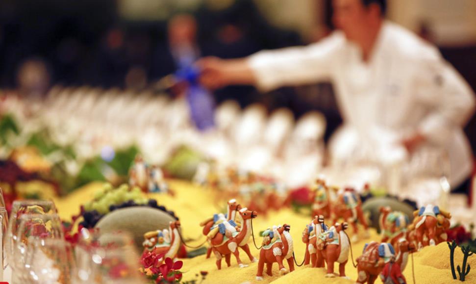 这次的晚宴餐桌有40米长,显得气势磅礴,中间有中国对外贸易的缩小模型,展现了中国从丝绸之路直到现在的贸易发展。晚宴菜单一共有9道菜,3种酒,那么具体是什么咱们就来一探究竟。