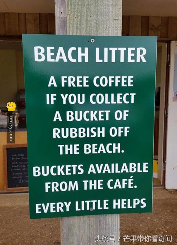 18.“如果你愿意从沙滩上收拾满一桶的垃圾,就可以获得一杯免费的咖啡,我们将为你提供桶”