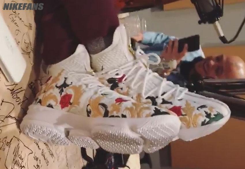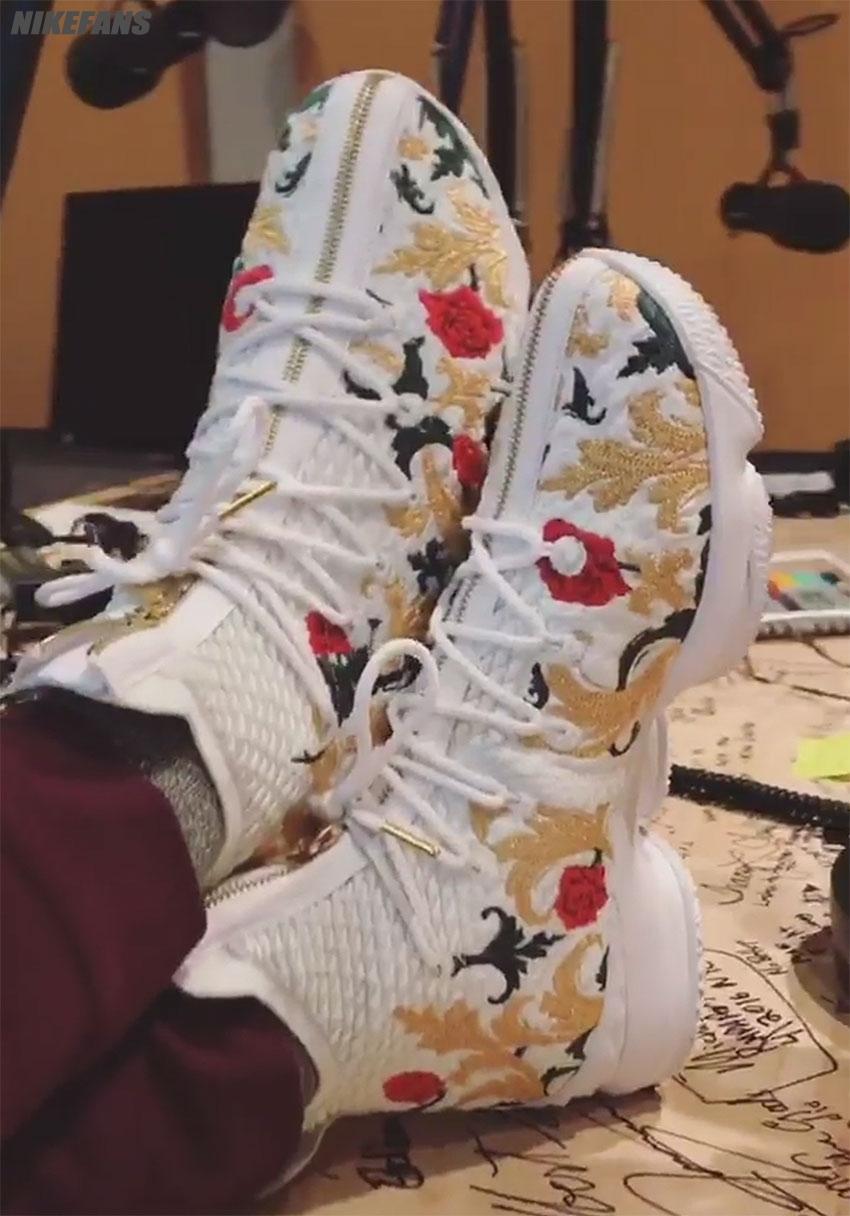 你可能很难相信这双大花鞋竟然是 LeBron 15,但这确确实实出自 Nike 官方的设定。此款白色的 BattleKnit 鞋身上附着着华丽的花卉刺绣,同时搭载全新的 BattleMax 鞋底呈现,不知 Maverick Carter 上脚后是否有了即将登基的感觉,不过一旁负责拍摄的 Victor Cruz 似乎乐开了花。