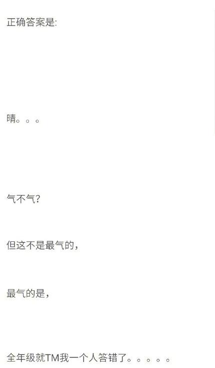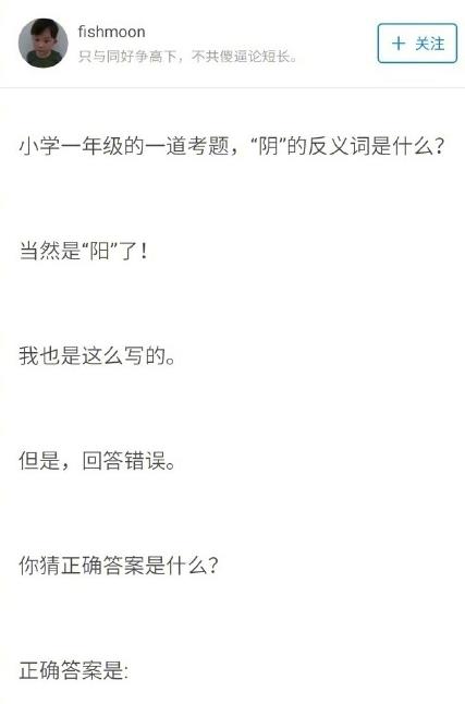 阴的反义词是什么?可能很多人的第一反应就是阳,因为阴阳这个词我们都是知道的,但是知道答案是晴之后就感觉世界不再那么的单纯,这还是小学一年级的题目,真是醉了,但是我百度了一下之后发现,原来这个题目是多解题。