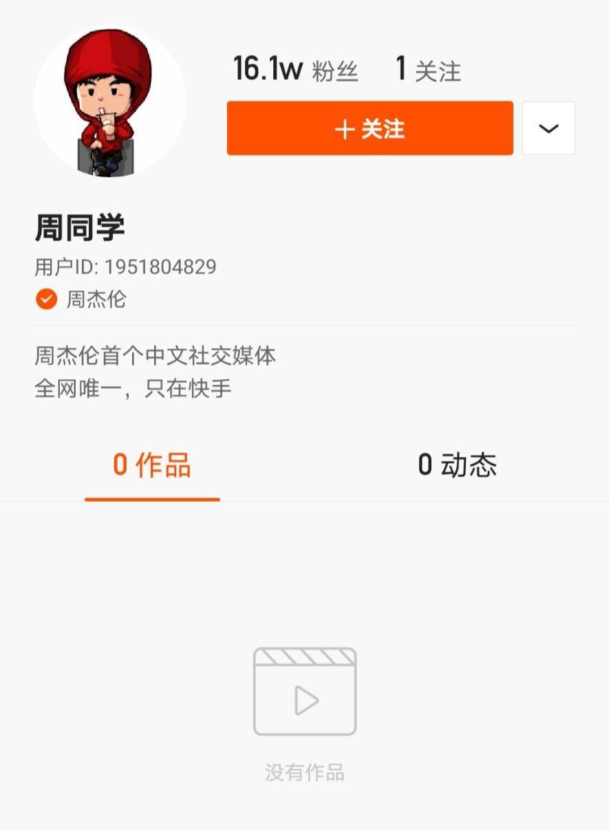 5月29日,周杰伦在某短视频APP开通了首个中文社交媒体账号,账号名为"周同学",认证信息为"周杰伦",个性签名为"周杰伦首个中文社交媒体账号",截至目前该账号关注一个,粉丝已经16万多,还没有发布任何作品和动态。
