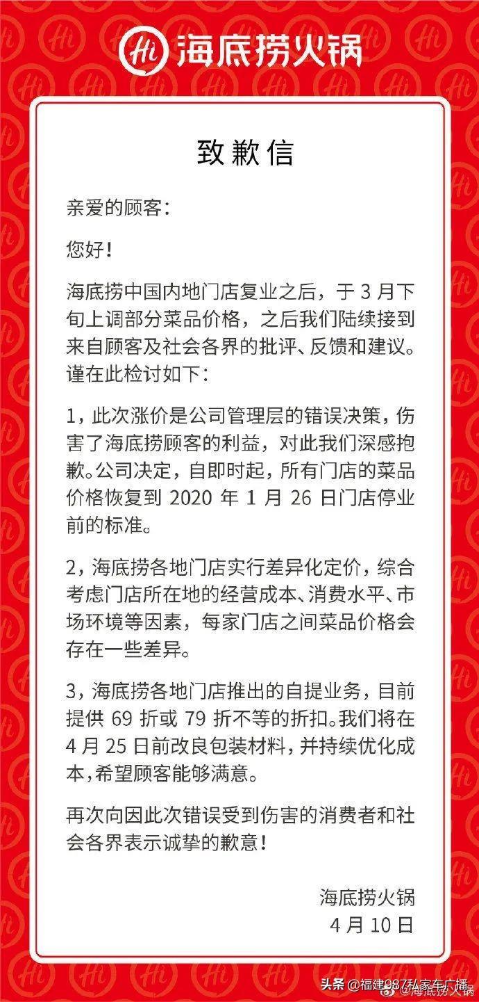4月10日,海底捞在其官方微博发布通告就涨价致歉:海底捞门店此次涨价是公司管理层的错误决策,伤害了海底捞顾客的利益。对此我们深感抱歉。自即时起,中国内地门店菜品价格恢复到今年1月26日门店停业前标准。