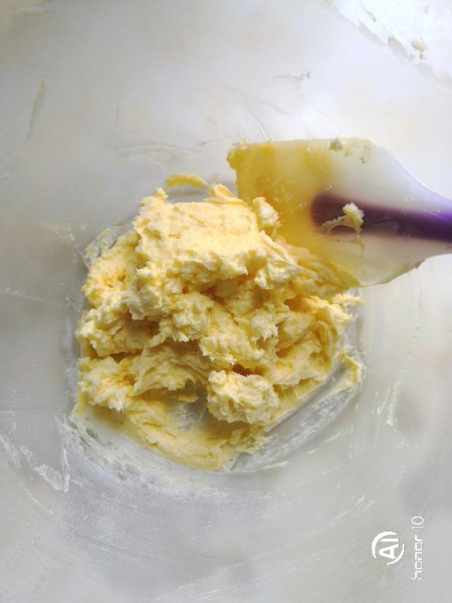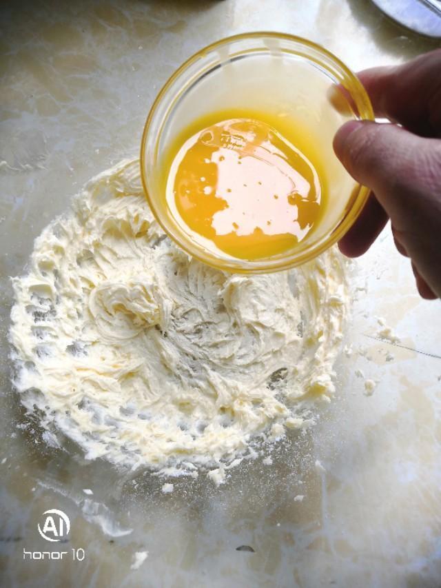 打发到体积膨大,颜色变浅后,把蛋黄先搅散,然后把蛋黄少量分次倒进去打发,等蛋黄完全和黄油融合后再倒入下次蛋黄。