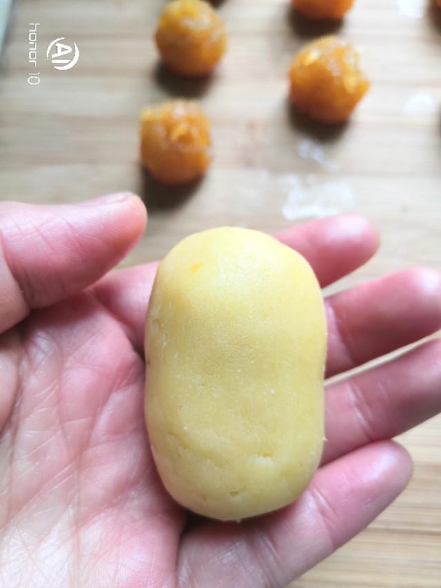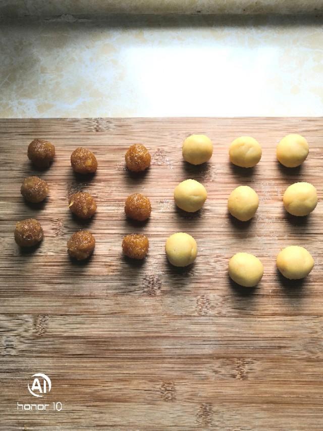 1小时后,把酥皮面团和风梨馅都取出来,馅分出9个15g搓圆,皮分出9个25g搓圆。