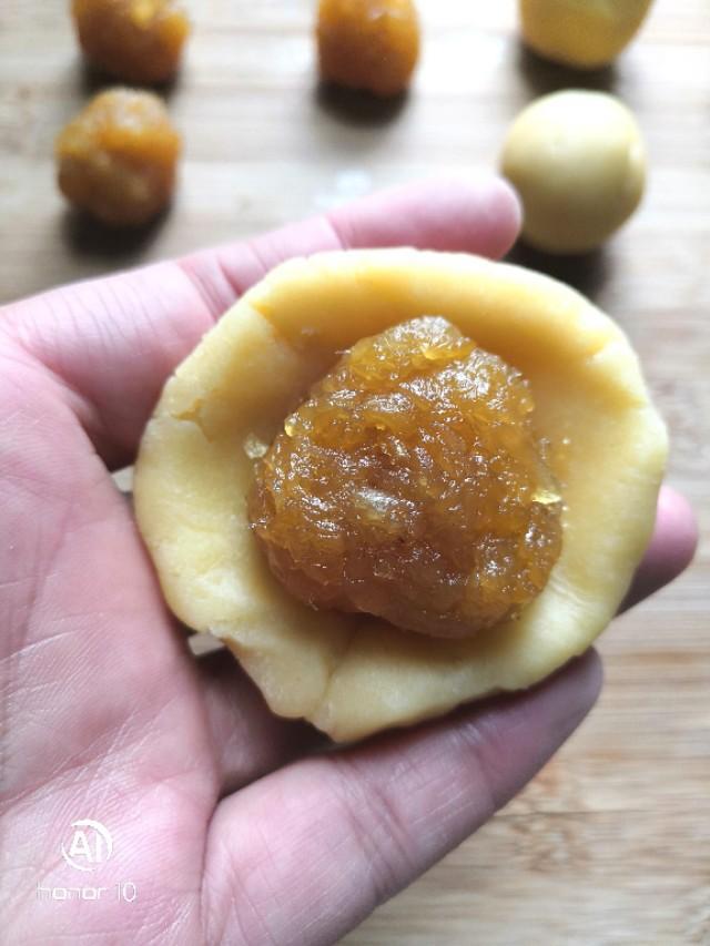 过滤一些果汁,把垛碎的果肉加80g冰糖放不粘锅中先开大火,等水份熬干了就转小火,放40g麦芽糖继续熬,熬到风梨馅颜色变深抱团。