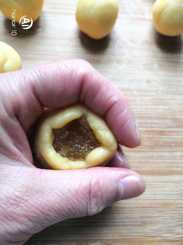 取一个面团压扁用虎口收紧的方法包上一个馅。