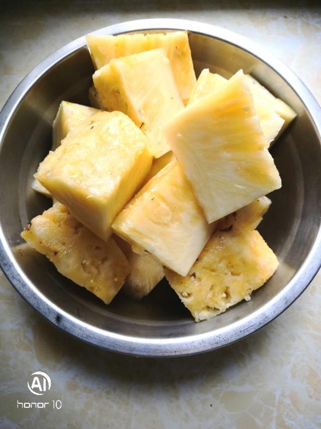 两个风梨(3000多克),去皮切块,取1000g果肉,用刀垛碎,这样能保留点纤维感。