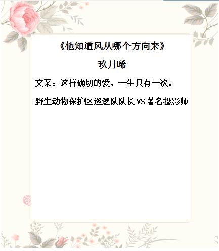 女主是知名摄影师高冷很有个性,男主是野生动物保护区巡逻队长,男主很man霸道且很深情。这是一篇关于爱情与事业,救赎与被救赎的小说,有点虐。