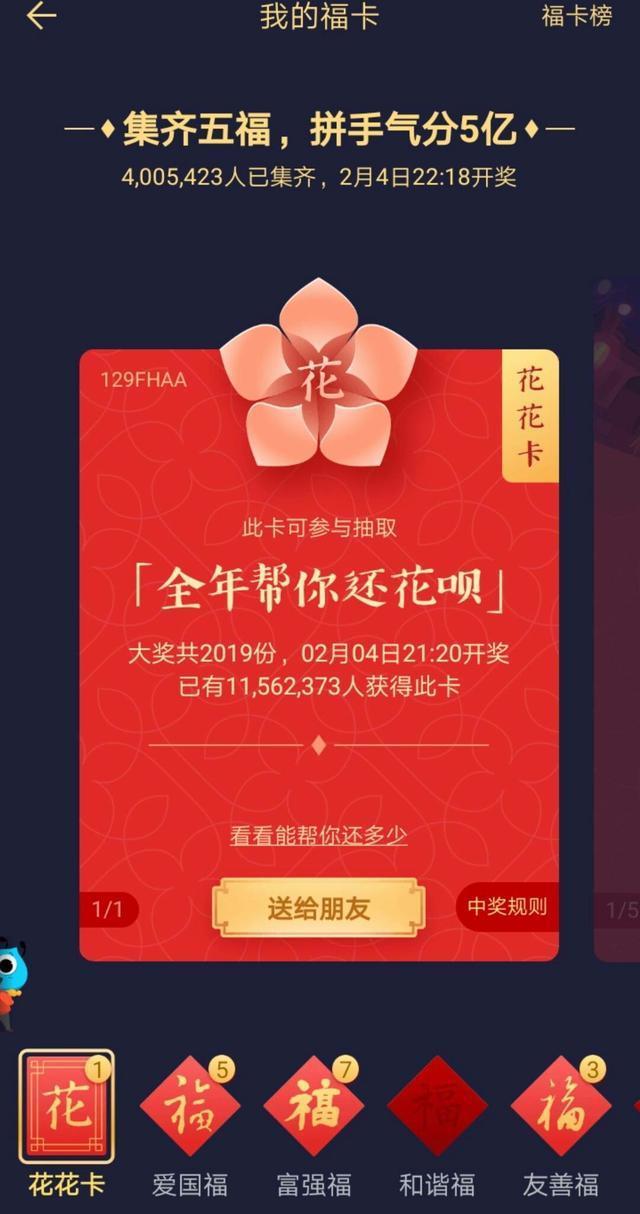 抽中花花卡就好了吗?并非如此,这张花花卡就像一张“彩票”,最后可以获得花花卡奖励的用户数量仅为2019个,即1亿张花卡,在里面抽2019个。 在2月4日晚21: 20开奖,如果花花卡左上角的数字与中奖号码完全相同,才算中奖,如果稍微不同,则不算中奖。