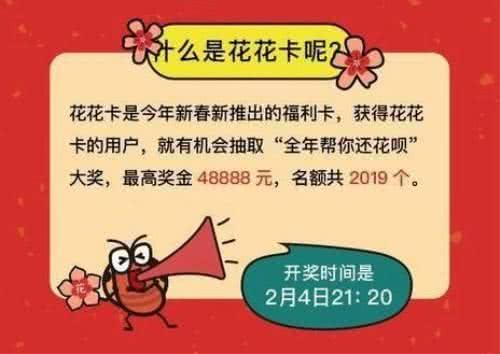 抽中“花花卡”的用户可参与支付宝“抽大奖”的活动,有机会抽取支付宝全年帮你还花呗的大奖,最高可以获得48888元全年还花呗金额。