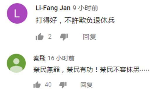 对于这段真实原因的曝光,台湾网友表示,“打得好,不许欺负退休兵”;“荣民不容抹黑。”↓