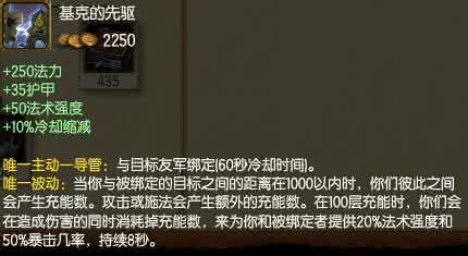 250的法力、30护甲、50的法强、10%冷却减免,主动是与友军连接,当充能达到最大之后,会提供8秒的20%法强和50%的暴击。不管是哪一种辅助都能够用这件装备来让ADC造成不俗的输出!