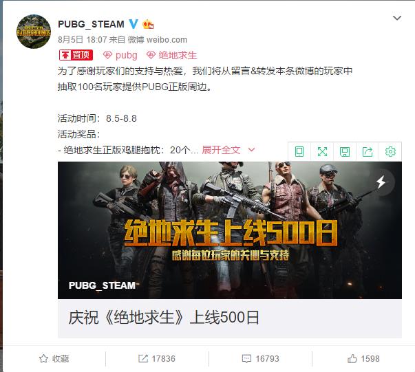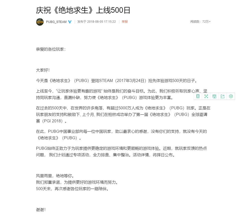 近日,蓝洞官方微博发布了一条纪念绝地求生公测500天的感谢信,其中描述了蓝洞在这段时间来的运营概括与对中国玩家的感谢,内容如下。