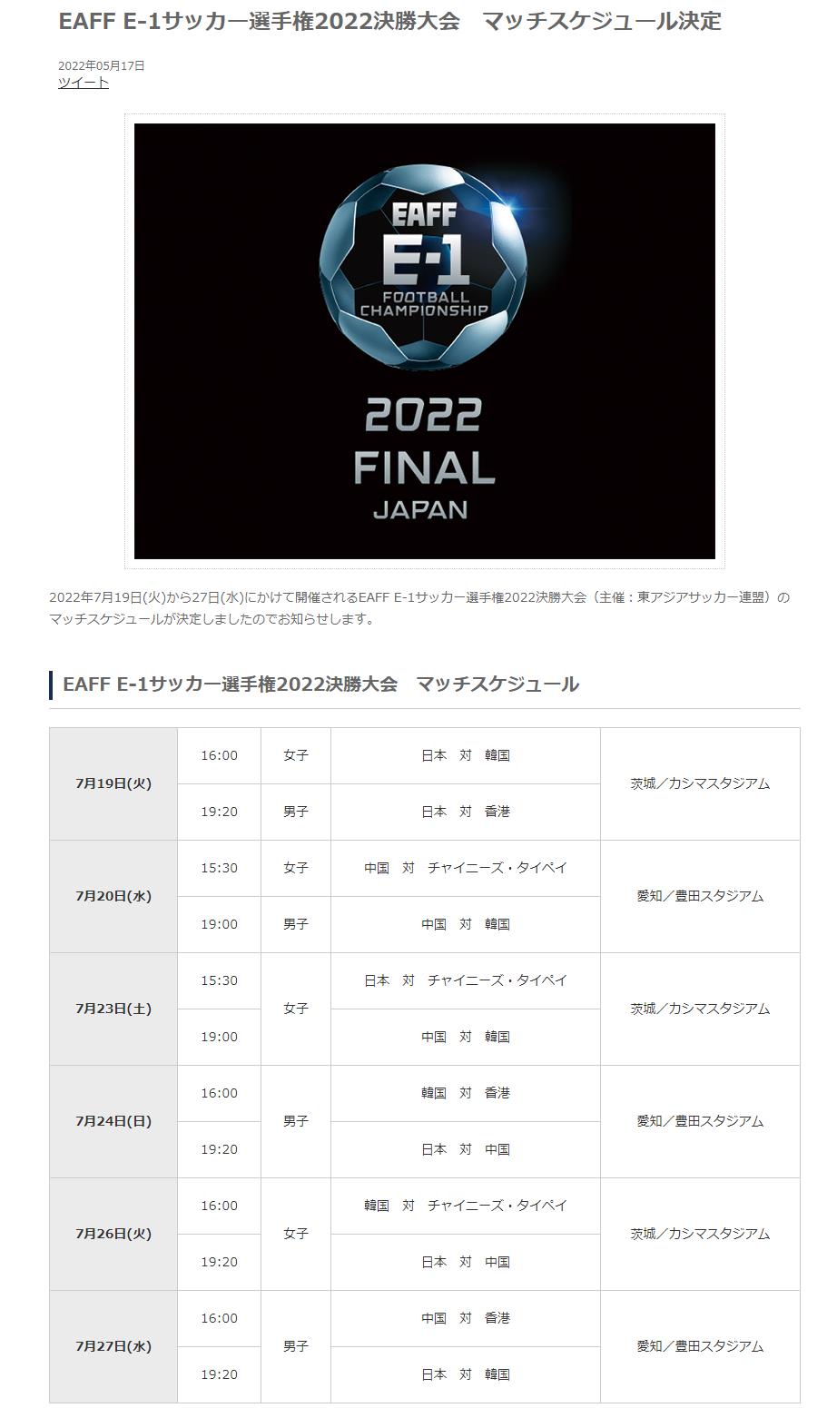 北京时间5月17日,日本足协官方公布了2022年东亚足球锦标赛赛程,本届赛事将于7月19日至27日在日本举行。中国U23国家男子足球队7月20日首战韩国,24日对阵日本。中国国家女子足球队将先后迎战中国台北、韩国以及日本女足。