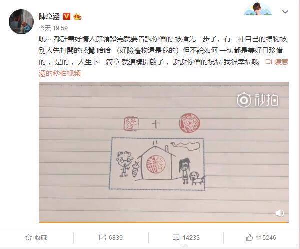 陈意涵在微博中称:“吼⋯ 都计画好情人节领证完就要告诉你们的,被抢先一步了,有一种自己的礼物被别人先打开的感觉。哈哈(好险礼物还是我的)但不论如何,一切都是美好且珍惜的,是的 ,人生下一篇章就这样开启了 ,谢谢你们的祝福 我很幸福哦!”并画出一家三口的漫画图,十分的温馨幸福。