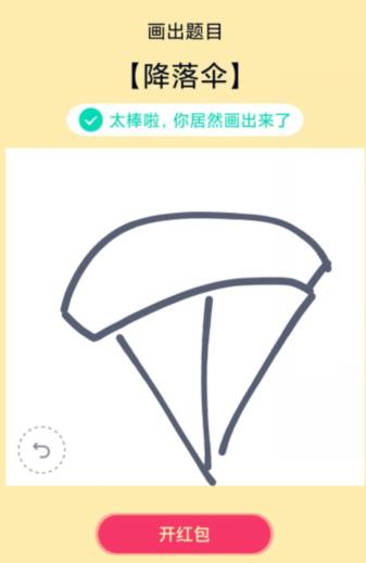 降落伞的画法是比较简单的,用户先画一个扇形,然后画上几条下端聚集的线条,识别成功即可领取红包。