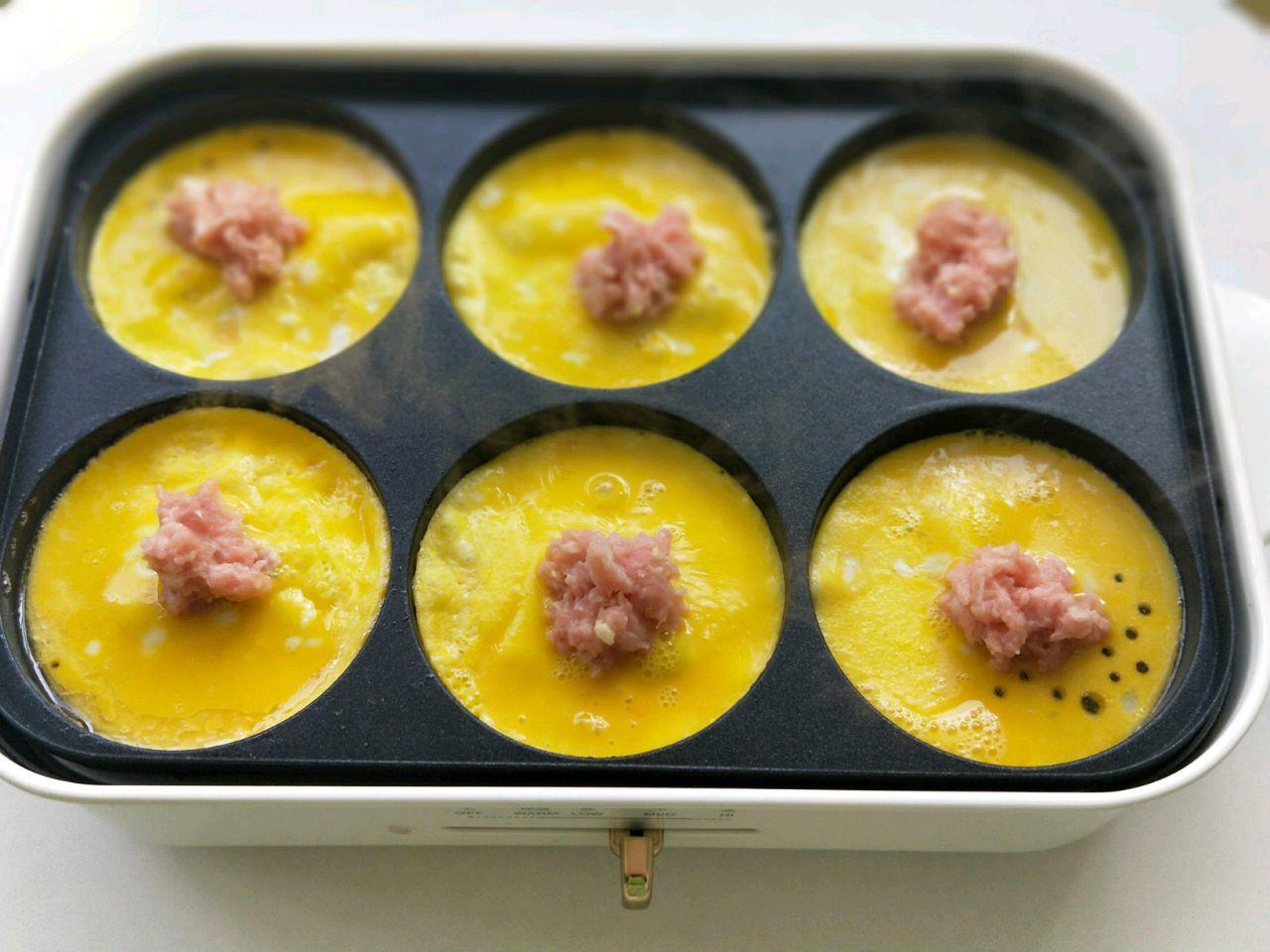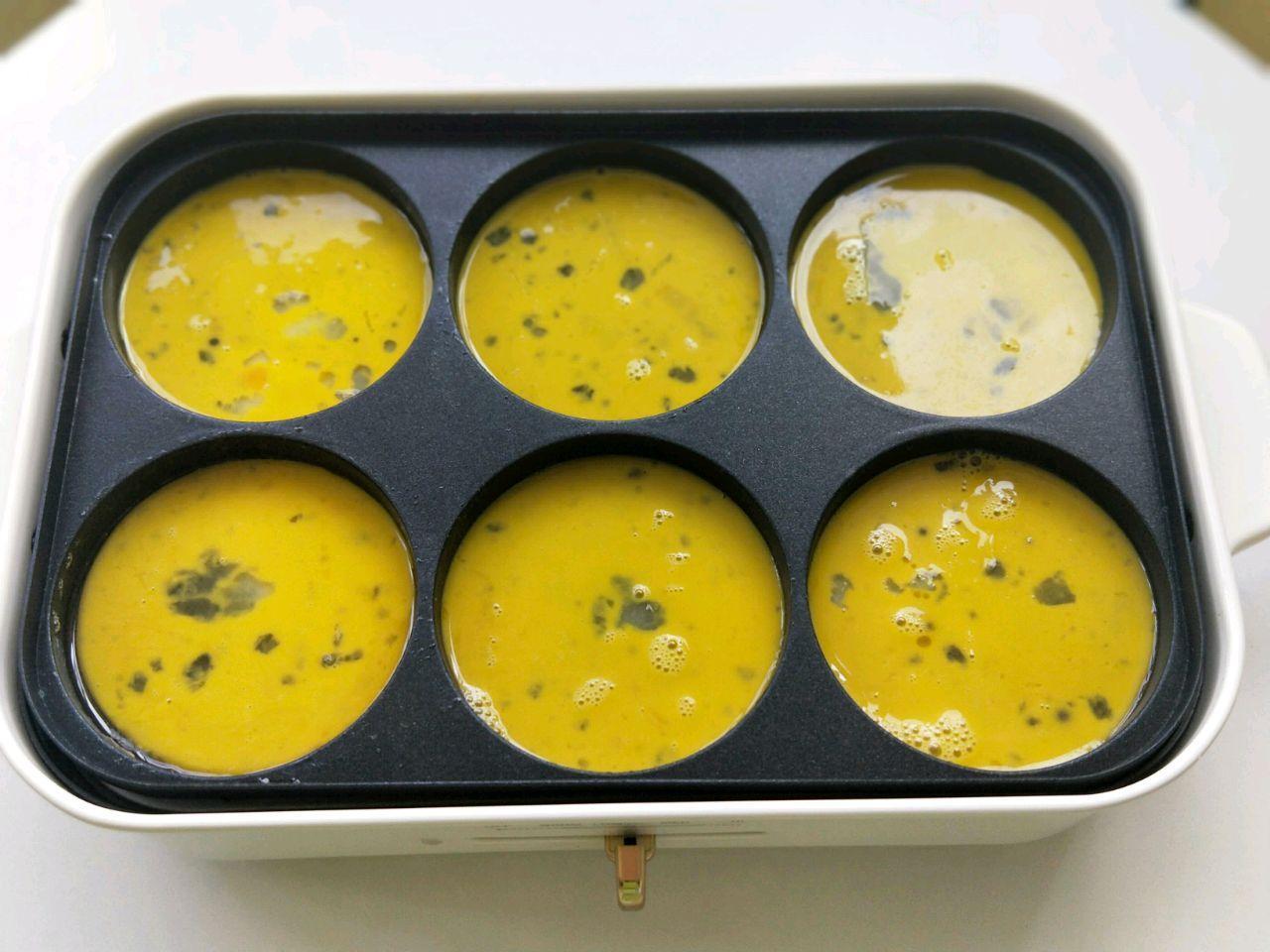 4、 我们这边是用多功能锅来做得更方便,一个盘正好能做6个,要是没有的话,我们就得用平底锅来做了。然后在每一个圆盘上面都刷上一点食用油。也可以用煎锅,电饼铛来制作,我也用过小的不粘煎蛋锅,还是觉得用勺子在明火上比较省事,这个自己觉得怎么方便省事怎么来哈。