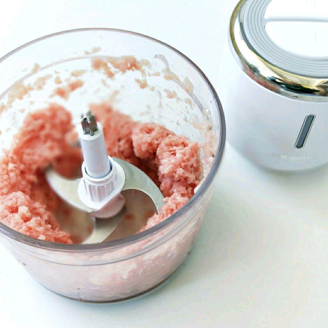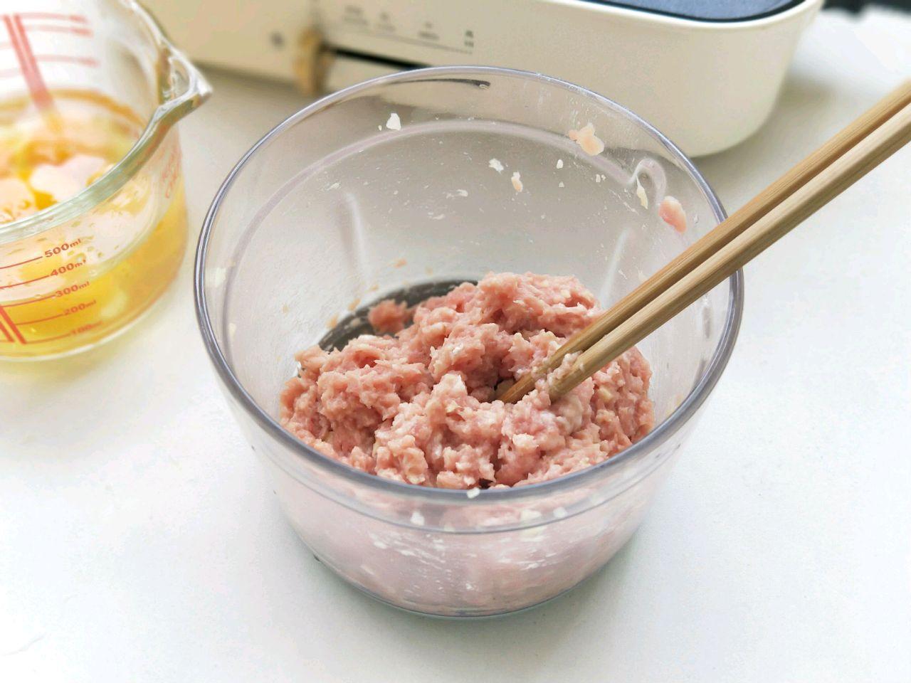 1、把从市场买回来新鲜的里脊肉清洗干净以后切成小块,然后把姜去皮也切成块一起放进绞肉机里面搅打成肉末。如果没有绞肉机也可以自己用手剁,剁成肉末也可以。