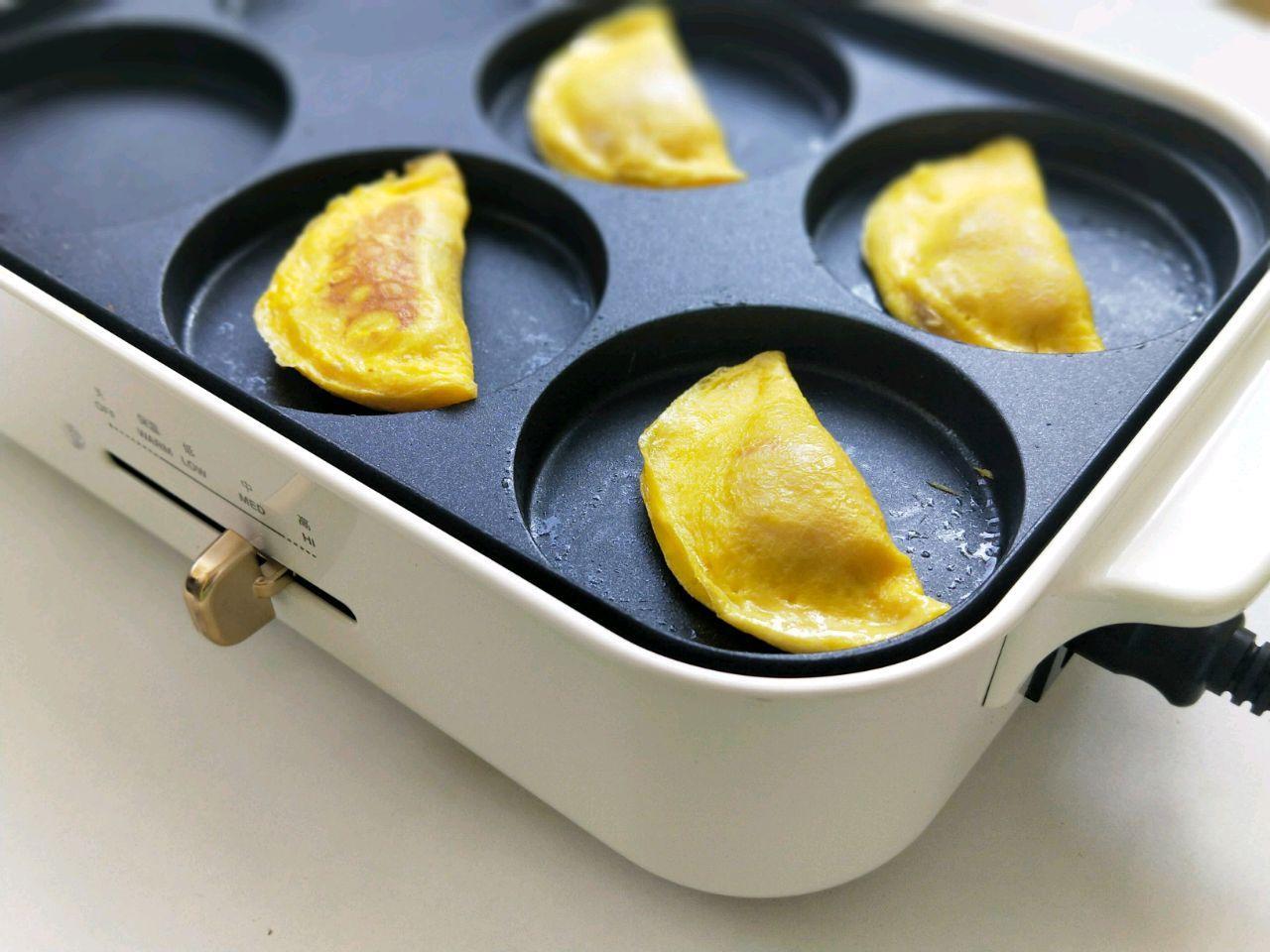 7、然后我们再用硅胶铲,将蛋皮翻一下盖住另一半即可,这样鸡蛋饺子就搞定了,一次做6个很快。肉糜包在蛋皮内,一直保持鲜嫩的滋味,营养不流失啊,所以味道依然很好,一端上桌孩子就连吃了2个,看来孩子都是“视觉动物”啊。