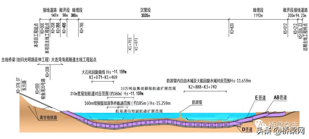 大连湾海底隧道自南侧东港商务区人民路K5+512进洞,经岸上敞开段、暗埋段于K3+820进入沉管段,下穿大港航道和调整后的甘井子航道,然后在北侧甘井子区梭鱼湾20号路登陆。项目全长5098m,其中海中沉管段长3035m,连接线长241m,南岸暗埋段长1192m,敞开段200m,北岸暗埋段长380m,敞开段长50m。