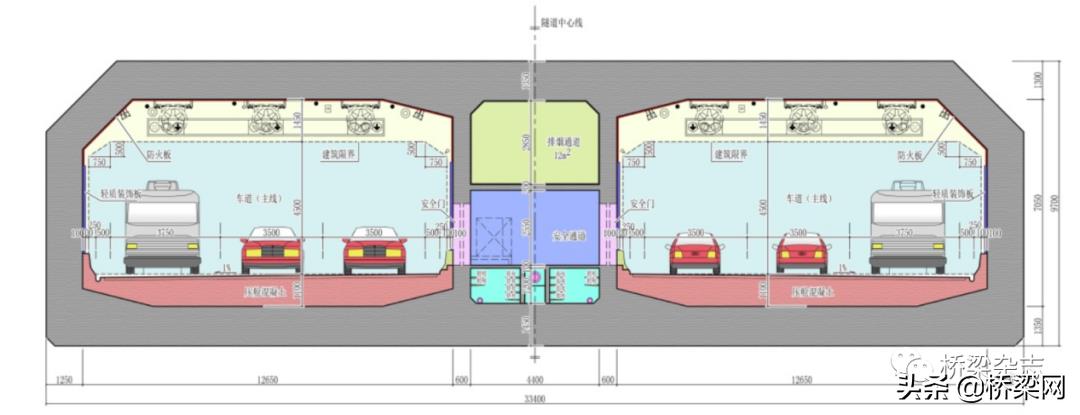 沉管隧道采用两孔一管廊截面形式,宽33.4m,高9.7m,两侧为行车道孔,中间管廊分为三层,上部为排烟道、中间为安全通道、底部空间用于布置市政管线及隧道运营电缆设施。