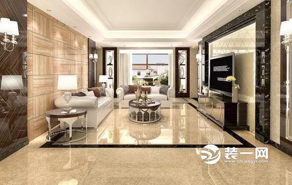 举例来说,客厅宽度为4.2米,铺贴800*800的瓷砖,一排排列过去,铺5片砖后剩余20公分,那么圈边线一般在10cm左右。或者将第5片砖裁切掉10公分,多出一个30公分,那么圈边波打线的跨度为15cm。采用两条圈边线,在设计的时候,一般会采取深浅搭配的方式,其中浅色的波打线和客厅所用的主砖一致。其中深浅色的波打线的宽度,一般按照深浅2:1,一般不采用深浅色宽度一样。