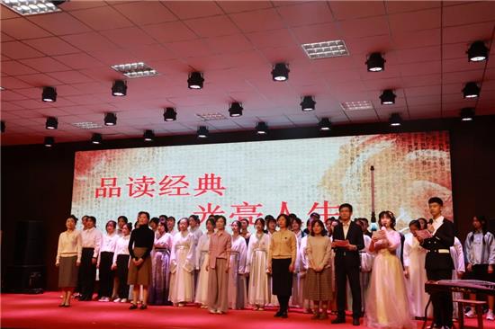 “让我们在这汉字织就的锦绣中穿行,让我们在这声韵汇成的河川里徜徉。让我们一起——品读经典,光亮人生!”随着主持人深情隽永的话语,潍坊新华中学“品读经典·光亮人生”2021“语文主题学习”汇报朗诵会拉开了帷幕。