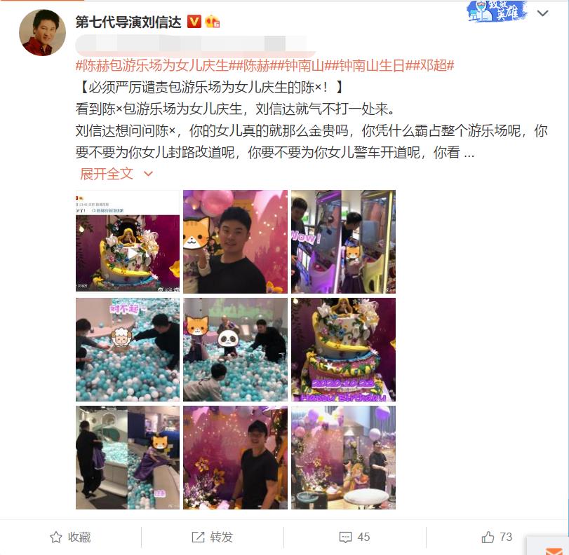 针对此次事件,向来喜欢出头的“第七代导演”刘信达也是在个人社交账号中开火。表示陈赫这样的行为容易养成自己孩子娇奢的性格,是不利于孩子的心理健康成长的。
