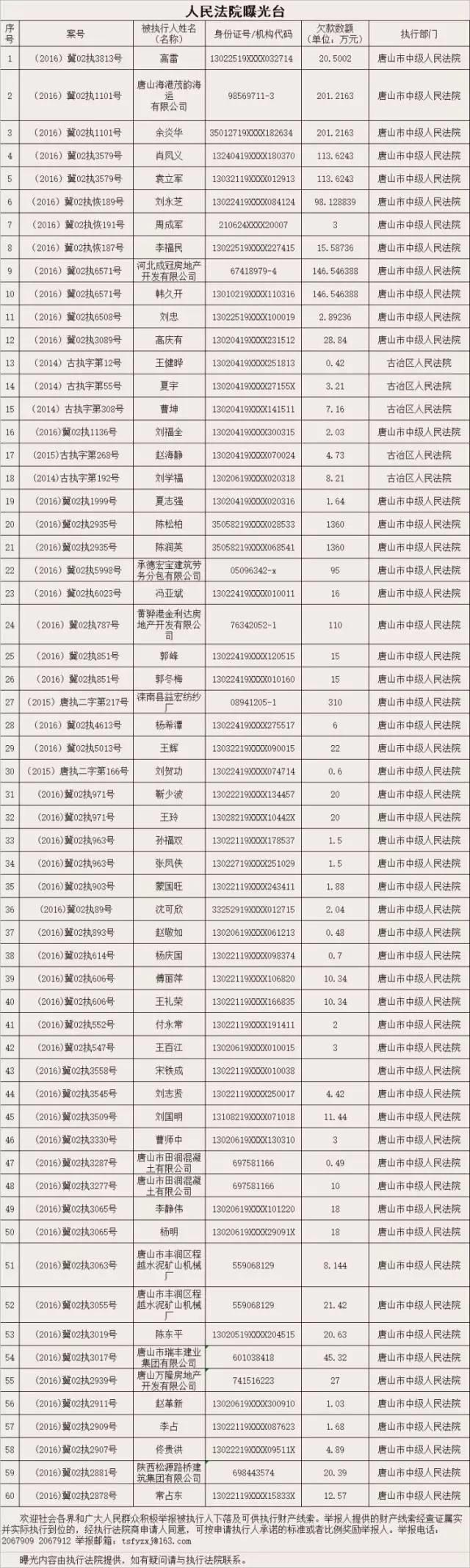 唐山市人民法院又曝光了60位被执行人姓名,他们欠钱不还!谁知道线索赶紧举报,还有奖励!