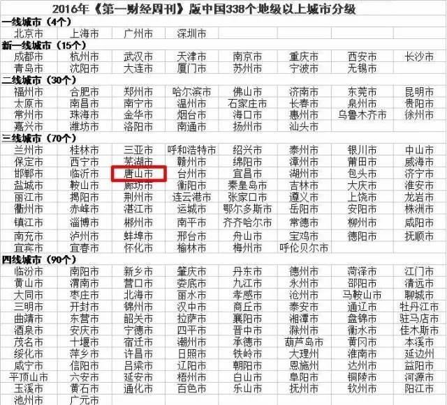 2016中国最新城市排名发布,《第一财经周刊》针对338个中国地级以上城市,按照商业资源集聚度、城市枢纽性、城市人活跃度、生活方式多样性和未来可塑性5个维度,重新评估了中国城市的商业魅力。在这份新的中国城市分级榜单中唐山是三线城市。