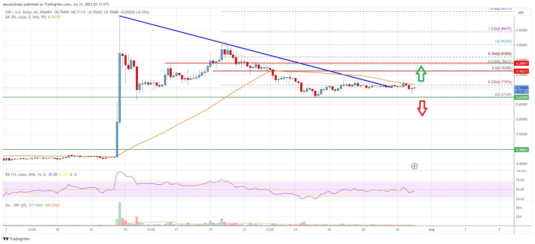 XRP/USD货币对的4小时图表已经突破了关键的熊市趋势线,阻力位在0.715美元附近。目前交易在0.725美元以下和55个简单移动平均线(4小时)以下。