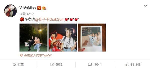 VAVA在微博PO出3张照片,都是跟DrakSun靠在一起的合照,其中一张男方还打着赤膊。她并未多加解释,只用emoji写下「恶魔在身边」,标记DrakSun帐号之后又加上几颗爱心,以简单的方式公开这段恋情,而男友随后也迅速转发、同样加上几颗爱心emoji,低调地示爱仍令粉丝狂呼被闪瞎。