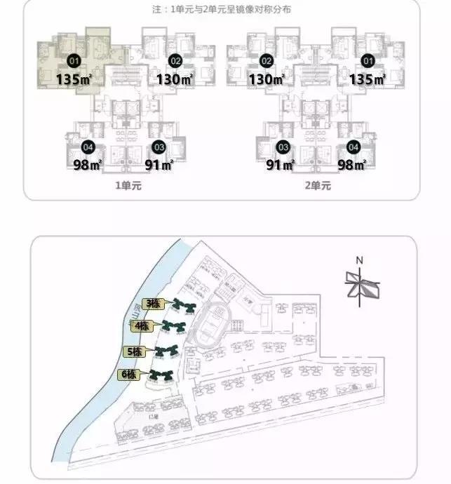 目前即将推售的是北区二组团(3#-6#栋),其中最先入市销售的预计为6#栋。3#-6#栋的户型格局基本一致,共有4种户型,分别为建面约93㎡3房2厅1卫、建面约98㎡3房2厅2卫、建面约130㎡4房2厅2卫、建面约135㎡4房2厅2卫。所有楼栋均为两个单元,每单元两梯四户,户型分布如图: