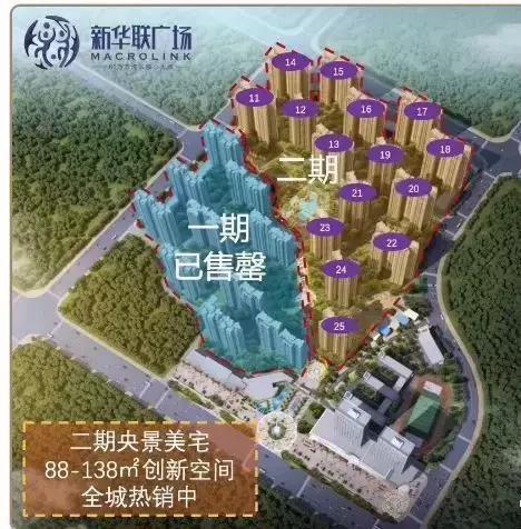 新华联广场位于大亚湾中心区北片、石化大道中段,紧临石化大道,南接商业中心与虎头山公园,北临大亚湾人民医院,东接市政广场与行政中心,西临行政机关办公大楼。项目总占地面积254000平米,总建筑面积949000平方米,配套五星级酒店、购物广场、商业街、幼儿园等。