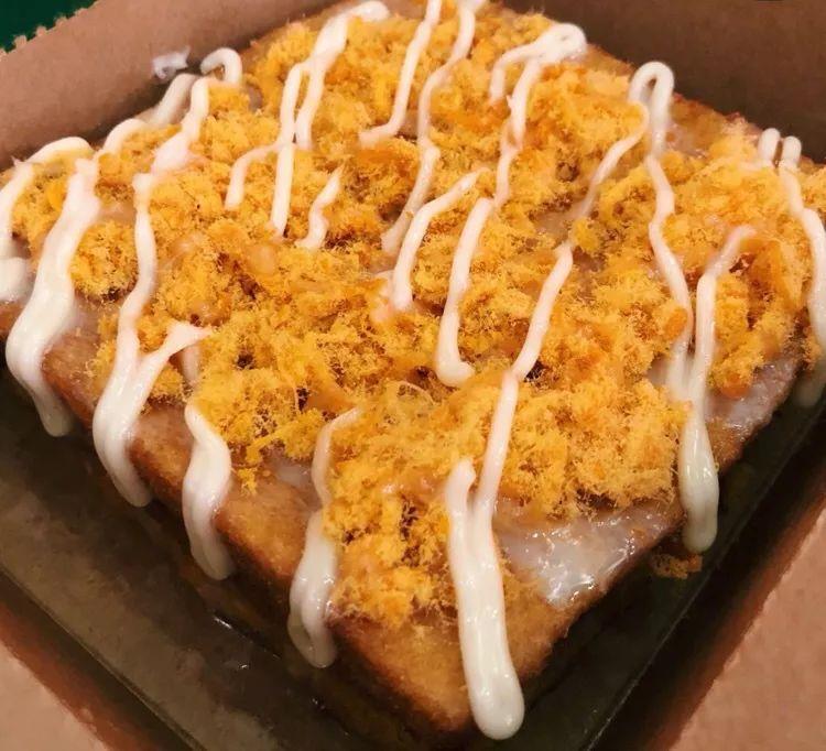 王者西多士,顶层是甜肉松加沙拉酱 ,肉松是不用钱吗!铺了满满一层 ,里面是爆浆芝士,吃多会稍微有点腻 ,可以两个人分一份!